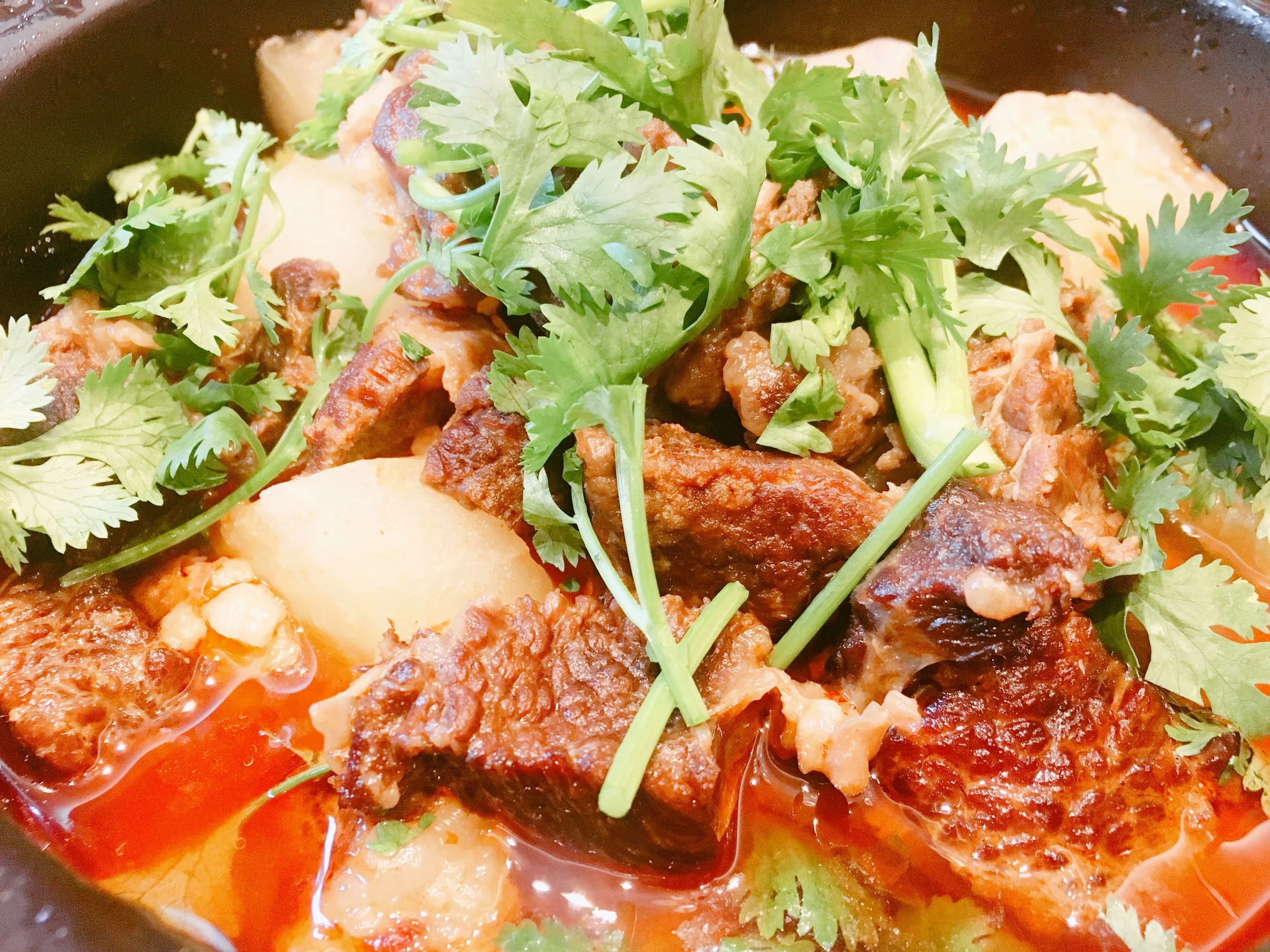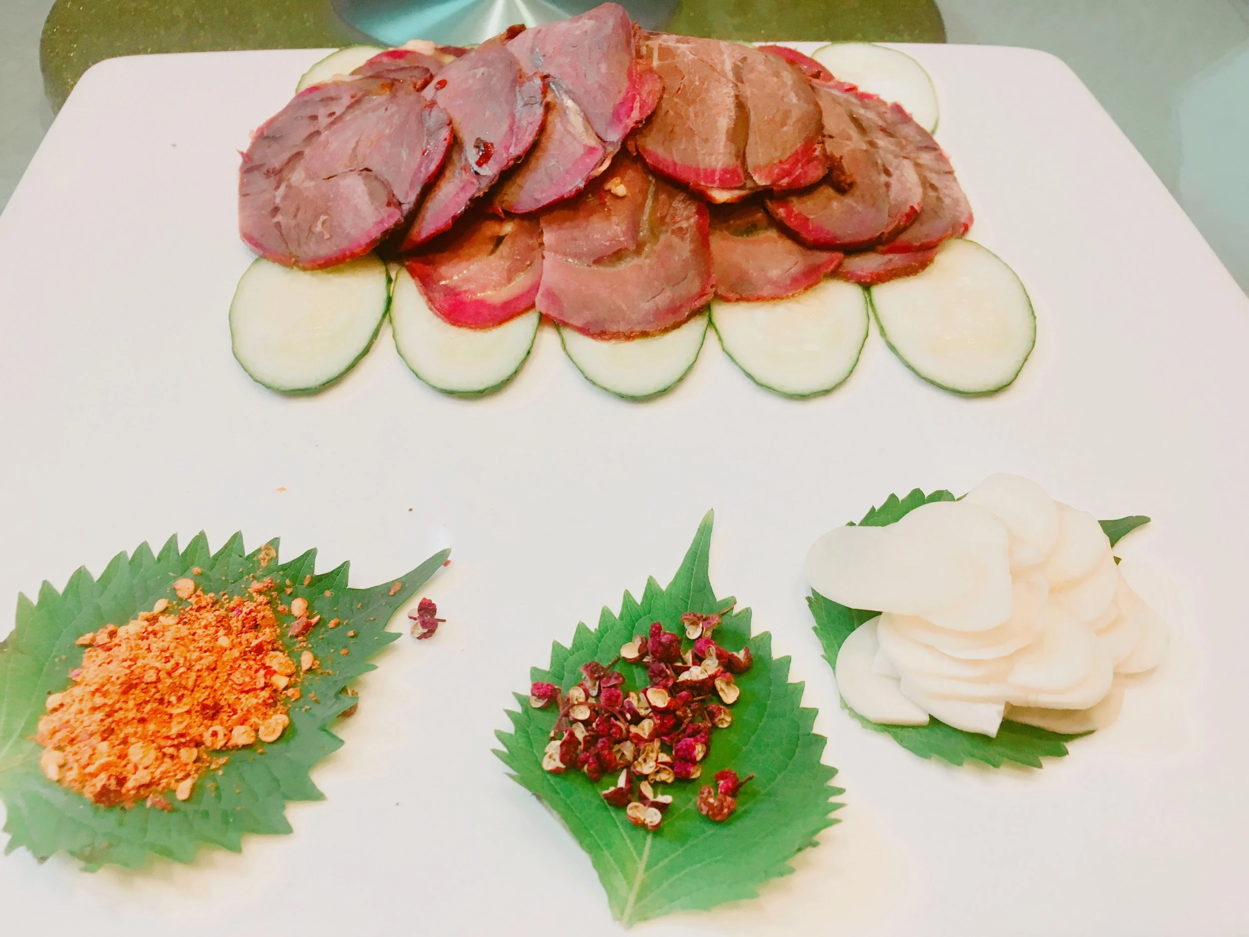 The dishes began arriving. First, a cold dish of sliced boiled, tendony beef served with local chili flakes and garlic slices. Next, sautéed yam leaves and a large claypot with vermicelli, mushrooms, peppers, and smoked pork.